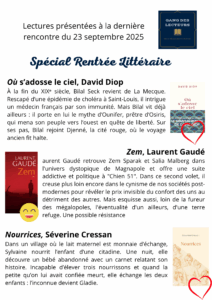 Club de lecture qui se réunit, environ toutes les 6 semaines, le mardi soir (en général) à 18h30. Dans la bonne humeur, les membres échangent sur leurs dernières lectures. Voir agenda.